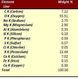 The chemical analysis of our Ashes shows Carbon, Oxygen, Sodium, Magnesium, Aluminium, Silicon, Phosphorus, Sulfur, Chlorine, Potassium, Calcium, Iron and Copper.