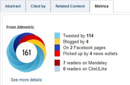 Individual article pages for these five journals will now have 'metrics' tabs that display the colourful Altmetric 'donut' badges. These badges indicate how much and what kind of attention each article has received. When clicked, the Altmetric badge leads into an article details page that displays the number of times the article has been mentioned in social media, newspapers, blogs, and other online sources. The conversations, discussions, and mentions themselves also appear alongside the article-level metrics.