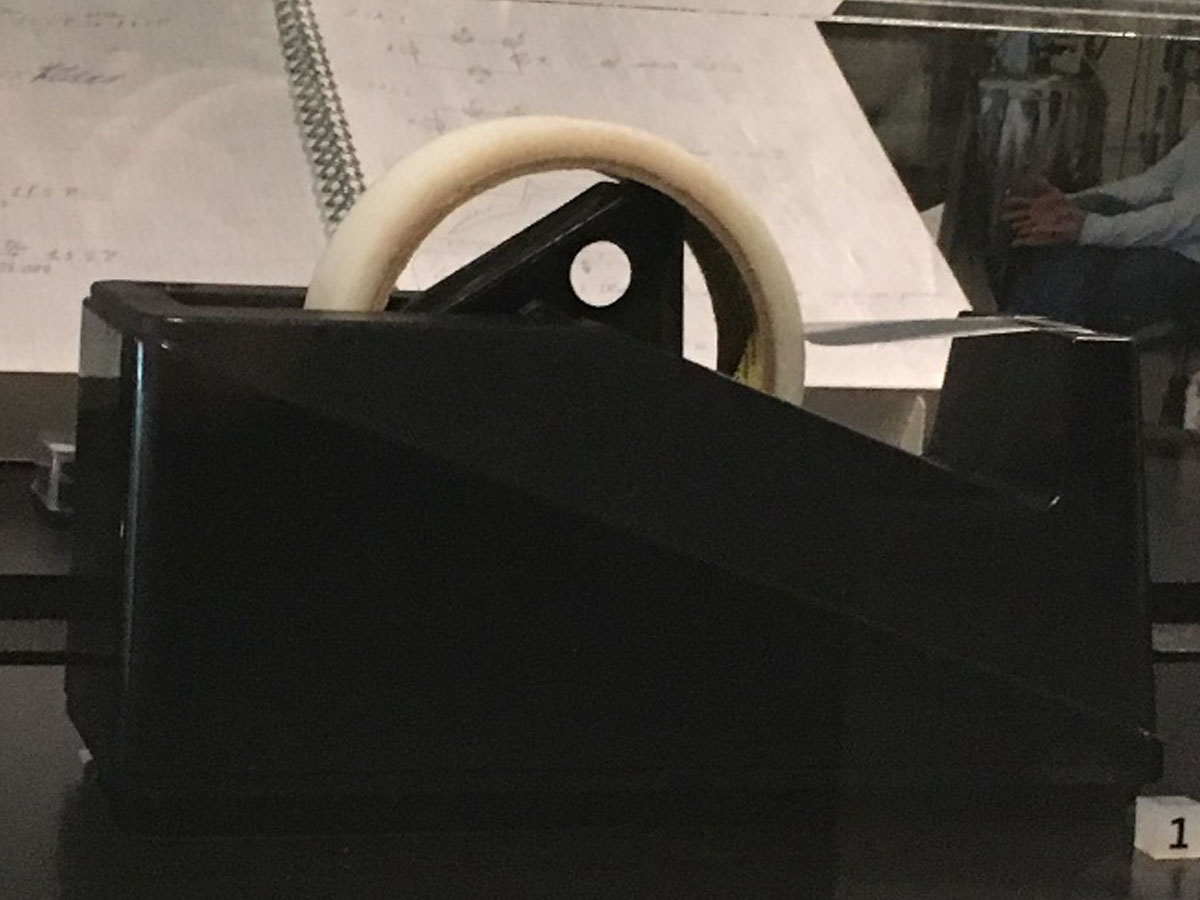 Graphene was first extracted from bulk graphite using micromechanical cleavage, otherwise known as the Scotch tape technique. A Nobel Prize was awarded for essentially pulling apart pencil lead with sticky tape, and so I was delighted to see artefact number one: a roll of everyday sticky tape. It stands displayed beside a video discussing the discovery of graphene and a lab book from the early days of graphene research.