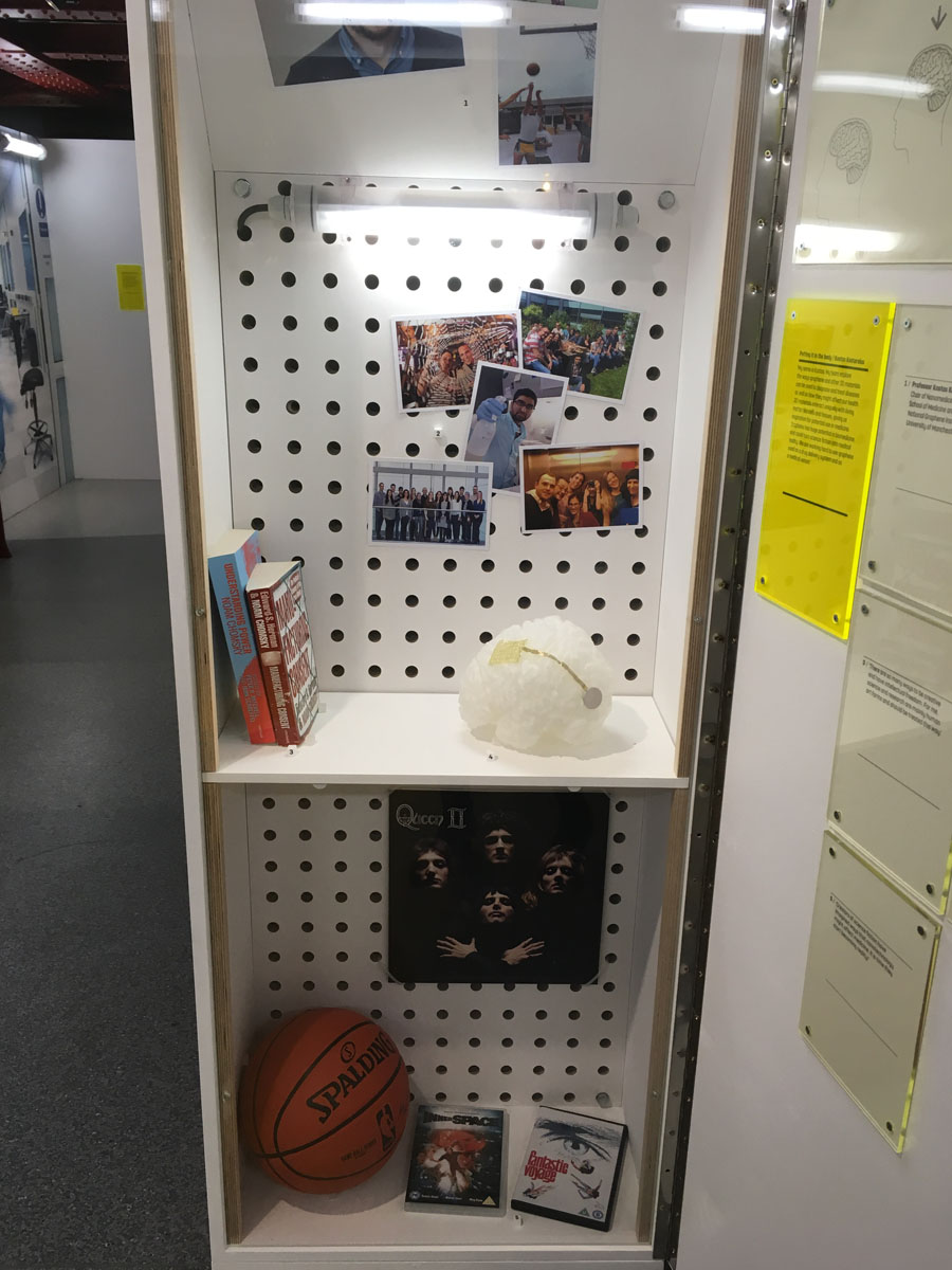 As visitors move through the gallery they find profiles of scientists who work with graphene beside lockers containing 'personal' items; lab coats, lab glasses, and research equipment, as well as books, DVDs, music, sports equipment, and photographs. By including the hobbies of these scientists, the exhibition helps to dispel the common stereotype of chemical scientists as insular and unsociable. This section sacrifices some scientific content in order to humanise the work which, in my opinion, is completely justified.