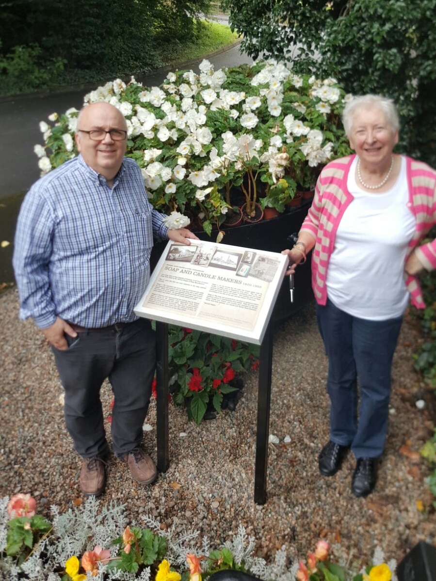 Dermot Hanna (NI Local Section) and Patricia Bogue (Donaghmore Historical Society) at the original vats from Browns Soapworks, now used as part of a floral display in the village of Donaghmore. Picture: © Dermot Hanna