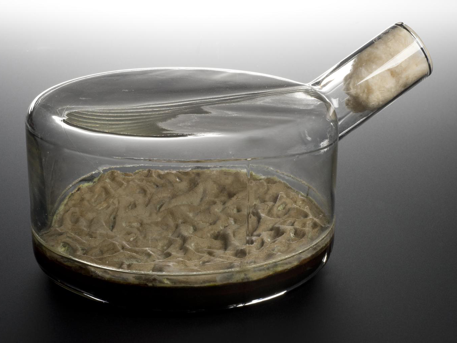 Thousands of glass fermentation vessels like this one were used in Glaxo (now GlaxoSmithKline) laboratories to produce penicillin. The penicillium mould was grown on the surface of a liquid filled with all the nutrients it needed. This approach was superseded by the method of growing the mould within large industrial fermenters. The antibiotic was first used in the early 1940s and saved the lives of many soldiers during the Second World War.