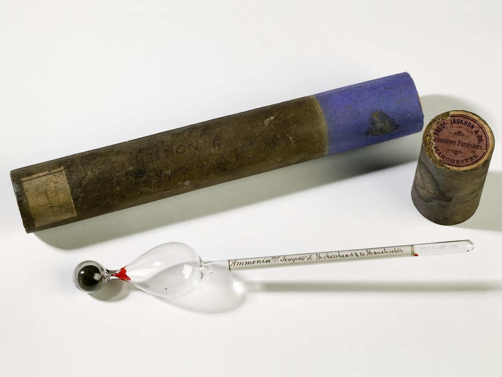This ammonia hydrometer was used at Grimshaw Brothers and Sons Chemical Works in Clayton. It was made by Mothershead & Co, Manchester, and sold by Fred Jackson & Co Laboratory furnishers, Manchester. It is shown here with its original packaging.