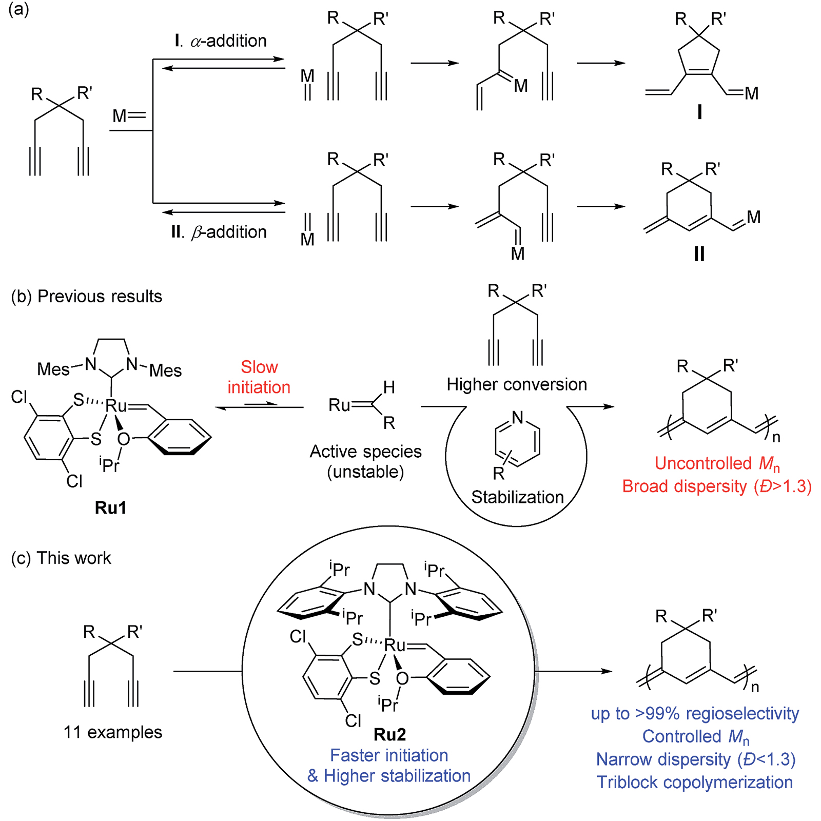 The new catalysts are able to achieve polymerisation with high selectivity, high molecular weight and low polydispersity. The starting monomers are 1,6-diynes – chains of seven carbon atoms including a triple bond at each end. These can form chains of either five- or six-membered rings, but the new catalyst is designed in such a way as to ensure six-membered rings are formed exclusively. This is one of very few instances in which this has been achieved.