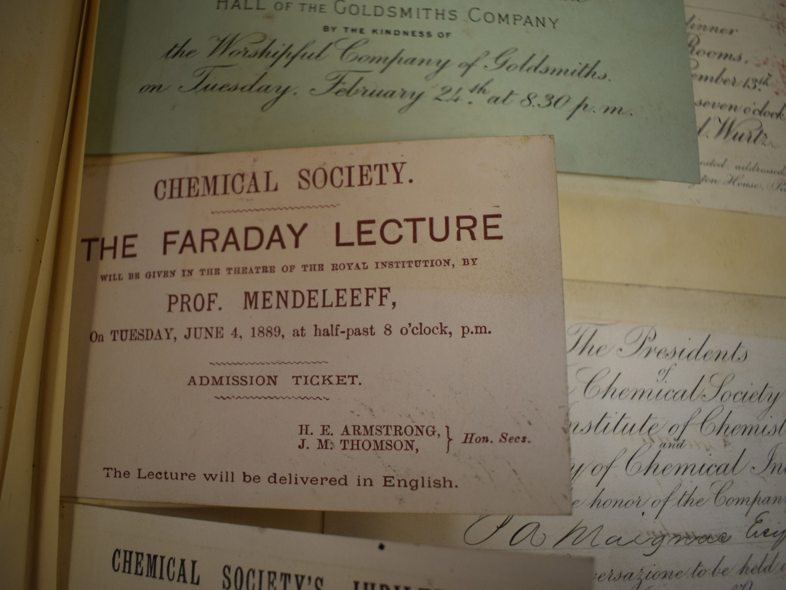 Professor Mendeleev was invited by the Chemical Society to give The Faraday Lecture at the Royal Institution on Tuesday 4 June 1889. Mendeleev had only been in a London a few days before having to rush home upon receiving a telegram saying that his son was ill. Professor Henry Armstrong gave the lecture – entitled 'The Periodic Law of the Chemical Elements' in his place.