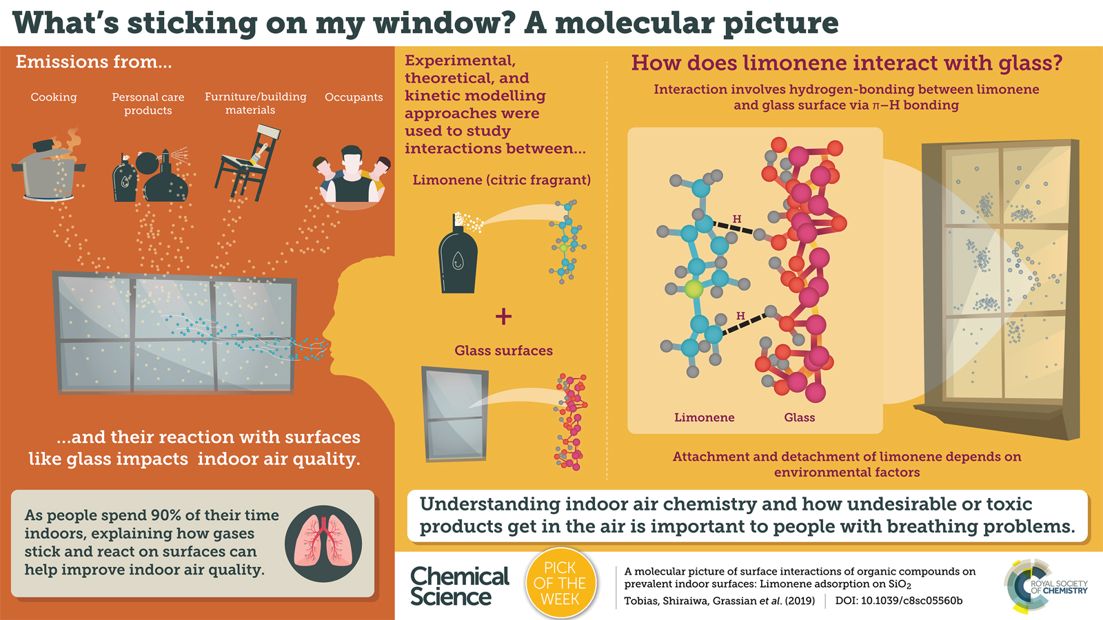 Professor Grassian and her team are researching a particular aspect of the indoor atmosphere – the interaction between glass and the types of organic compounds found in indoor environments. They have focused in particular on limonene – the chemical found in the peel of citrus fruits, and also used in household cleaners and air fresheners. They have looked at how limonene interacts with glass, how strong the interaction is, and whether limonene can "unstick" and go back into the gas phase.