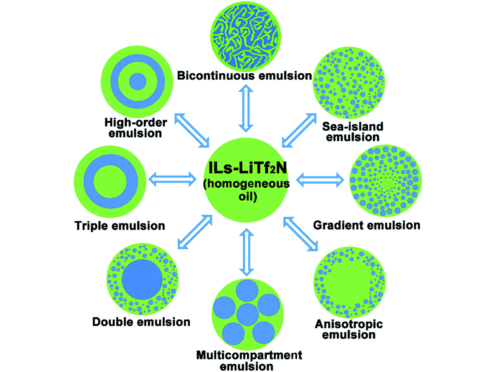 The researchers’ breakthrough was possible by using inorganic salts to draw water into oil from surrounding ionic liquids by generating an osmotic pressure – just like in the salad dressing. They found that one mixture in particular – organic salt LiTf2N and ionic liquid 1-alkyl-3-vinylimidazolium bis(trifluoromethanesulfonyl)imide – showed unique properties.