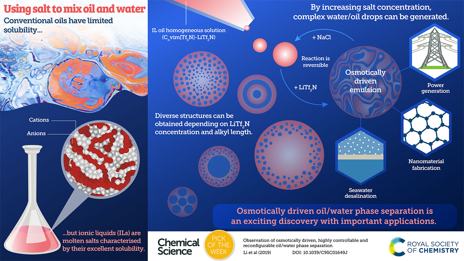 To explain their work, published in Chemical Science, scientists from Tsinghua University in China used the example of making a salad dressing: "When you make a dressing, the oil and vinegar never mix," said corresponding author Professor Guangtao Li. "However, imagine a drop of oil in vinegar which contains a lot of salt inside.
