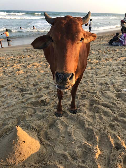 Two students were kind enough to give up their Saturday to take us to a famous historic site outside of Chennai called Mahabalipuram. The temple was amazing, and we also walked on the beach. Yet again there were happy cows everywhere, including one that looked like he’d just built a sandcastle!