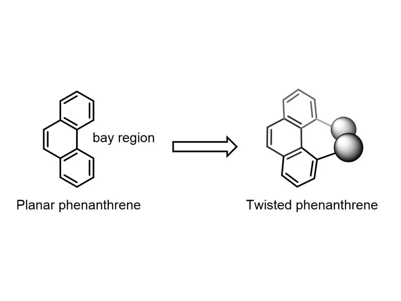 Phenanthrene is a planar polycyclic aromatic hydrocarbon, consisting of three fused benzene rings. If we add bulky substituents into the 'bay region' of the molecule, the steric hindrance will cause the molecule to twist away from the plane. These non-planar phenanthrenes have interesting properties that open up exciting possibilities for a range of applications – from optics and electronics to anti-inflammatory and antimicrobial drugs.