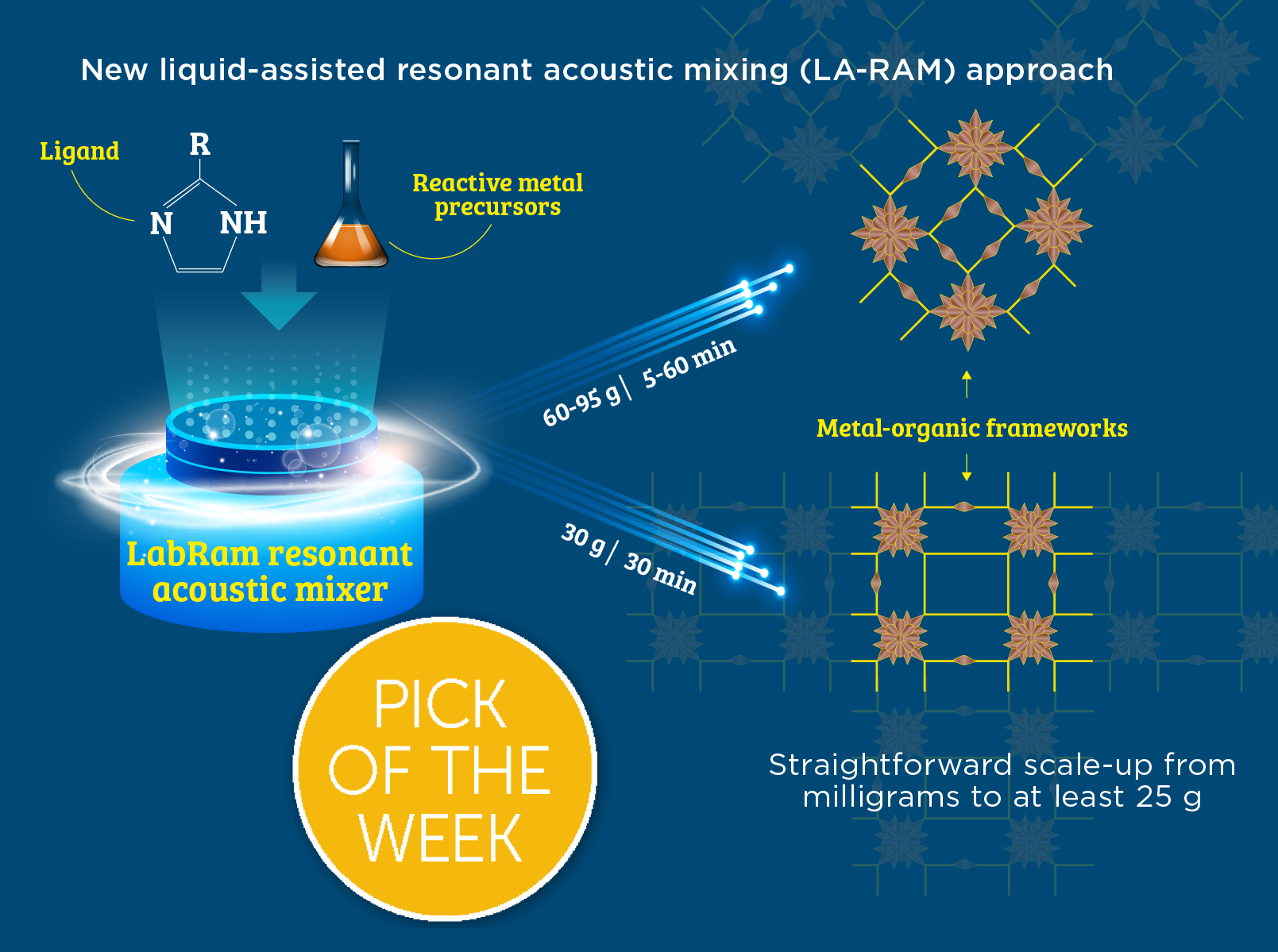 Our ChemSci Pick of the Week demonstrates the scalable synthesis of metal-organic-frameworks (MOFs) using ultrasonic or acoustic frequencies – rather than solvent-based approaches.