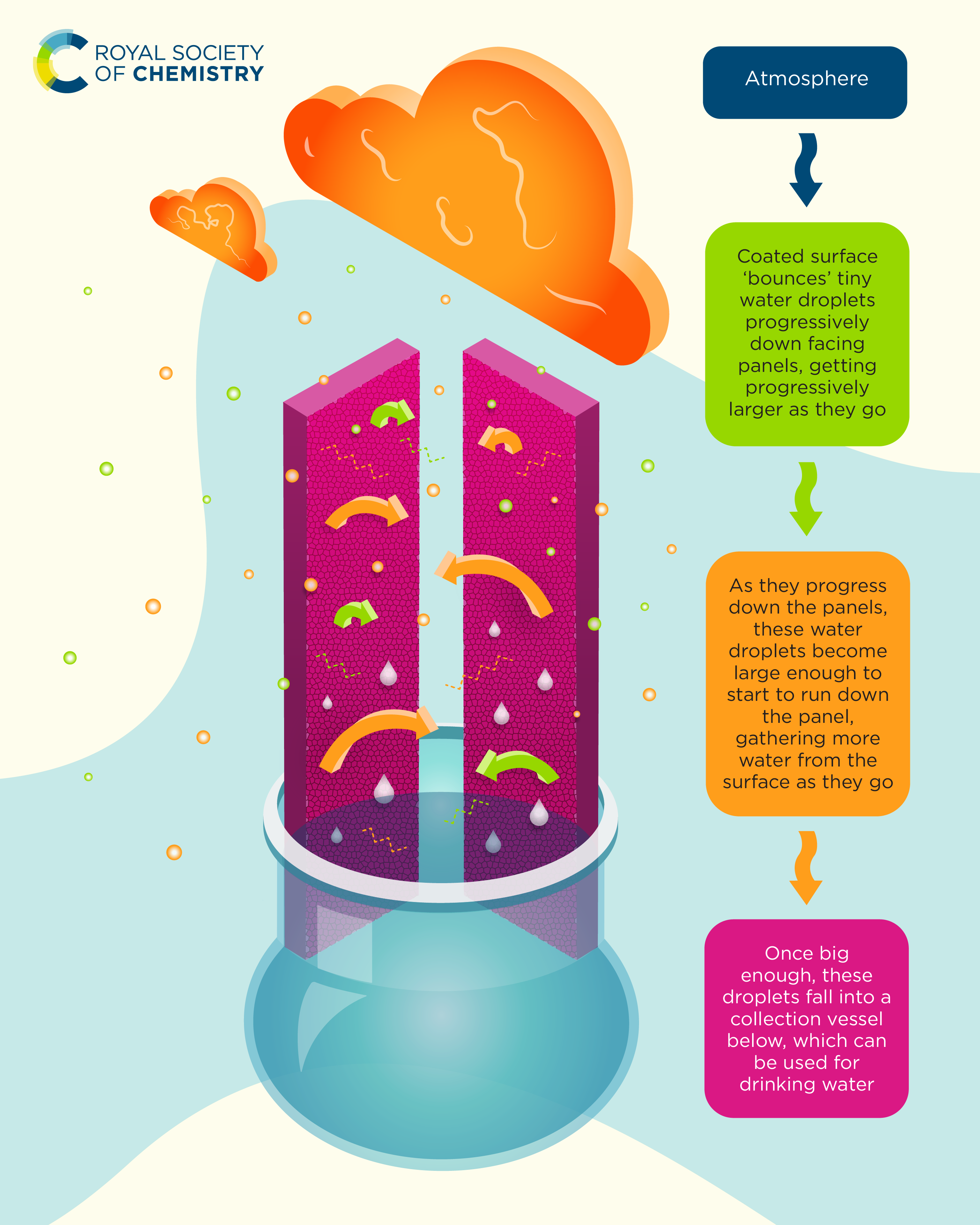 By coating two facing surfaces with this paint, condensed water trapped in air can be 'bounced' together into droplets, resulting in them falling into a collection vessel below. And because the system is passive, it doesn’t need power to collect the water.
