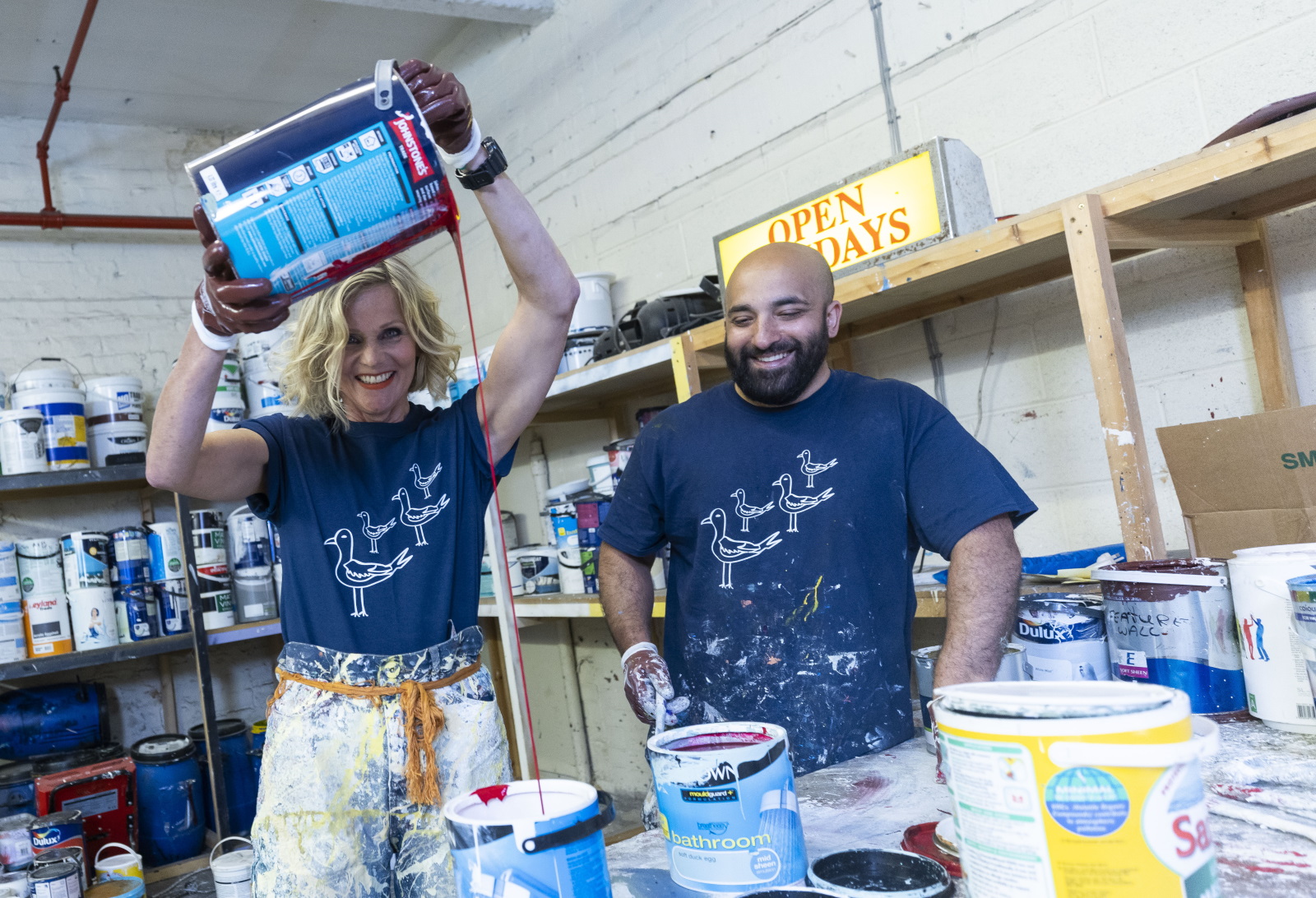 Seagulls' colourblind paint mixer, Ruksar Ajmal, shows Linda Barker how they recolour paint for customers Picture: Royal Society of Chemistry
